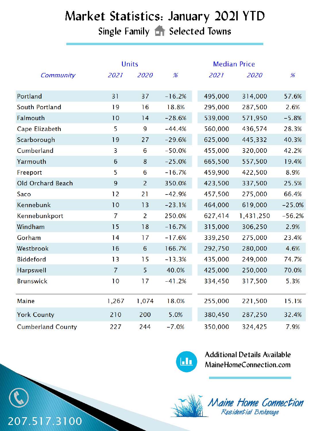 Continuing an ongoing theme, buyer demand for Maine’s real estate is strong and for-sale home inventory is historically low as the median sales price (MSP) for a single-family home in Maine rose 15% to $255,300 and sales volume increased 18% comparing January 2021 to January 2020.